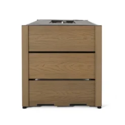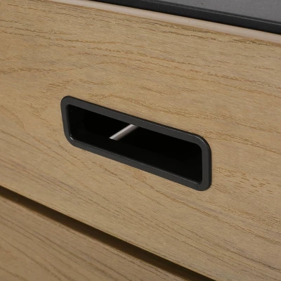 WOOD RESIN: Using a unique combination of wood and resin, this synthetic wood offers the aesthetics and textures of real wood without the high upkeep. This is finished with a slat panel design for a rustic look and handles for easy transport.