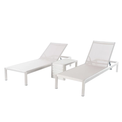 - Includes: One (1) C-Shaped Table and Two (2) Chaise Lounges