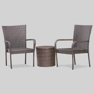 This outdoor Christopher Knight Home Littleton 3 Piece Wicker Stacking Chair Chat Set has been uniquely paired for your convenience. With two stacking wicker chairs, this set is both unique and comfortable. The stacking feature of the chairs allows you to easily store these chairs and the table in one place when you need this set out of the way. The table is made with sturdy wicker that is great for outdoor use and will be perfect for anything you want to use it for.