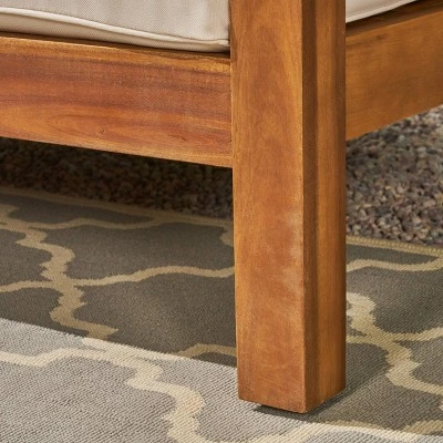 Bring home our gorgeous U-shaped outdoor sectional sofa set as the perfect centerpiece for your next backyard get-together. Seating up to eight people, this fully modular set can be arranged in any way you like, making this a dream for those who love to personalize their living space. This set encourages company and conversations on those warm summer days with its solid acacia wood frames, plush outdoor cushions, and traditional slatted coffee tables.ACACIA WOOD: Our sofa set is made with acacia wood that brings a sleek yet natural look to your space. Perfect for resisting normal wear and tear, this durable hardwood maintains a sturdy foundation that can withstand most outdoor elements and will not darken over time.WATER-RESISTANT CUSHIONS: Our cushions are covered with a non-porous material that makes cleaning any spills a breeze. The seat cushion includes easy closure ties to ensure that you can spend all summer lounging outdoors in comfort. Please note that these cushions are water-resistant and not waterproof. Please do not submerge in water.ONE YEAR WARRANTY: With a one year warranty, you can enjoy your set all summer long knowing you are covered until your next summer season.ASSEMBLY REQUIRED: Some assembly is required for this chat set. All of the instructions and tools needed for assembly are included.SET INCLUDES: This set includes one right-arm piece, one left-arm piece, four armless pieces, two corner pieces, and one coffee table.